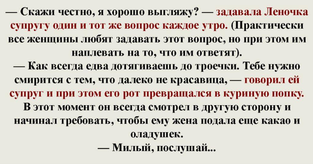 — Скажи честно, я хорошо выгляжу? — задавала Леночка супругу один и тот же вопрос каждое утро. (Практически все женщины любят задавать этот вопрос, но при этом им наплевать на то, что им ответят).