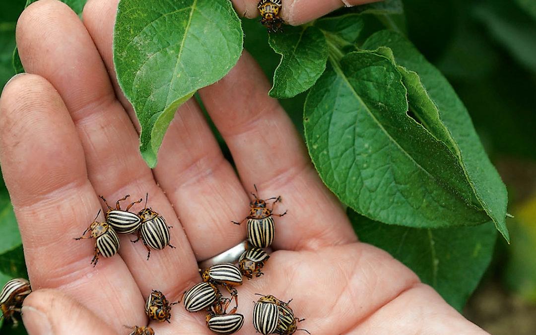 Собираете их прямо с земли в банку. А картошка будет довольна, ведь ей нравится, когда ее стебли пригибают.
